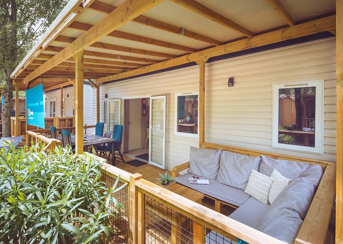 Ein weiteres Plus dieses Mobilheim Premium Lounge ist die große überdachte Holzterrasse, auf der Sie jederzeit draußen sitzen können. Die Terrasse ist mit einem Roan-Sonnensegel gegen die tiefstehende Sonne und für mehr Privatsphäre und modernen Gartenmöbeln ausgestattet. Auf der Seite des Campingplatzes können Sie nachlesen, welche kostenlose Grillplatte Ihre Unterkunft hat.